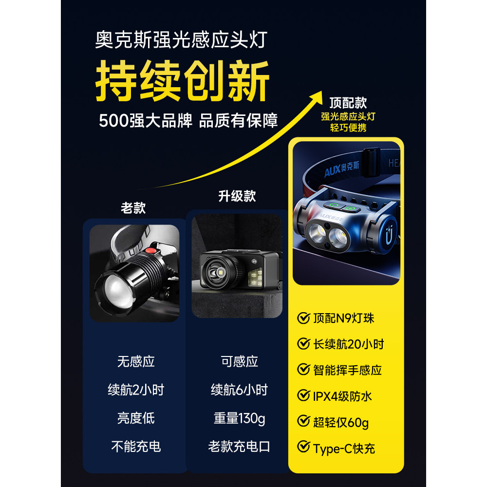 天猫奥克斯头灯防水20小时续航户外运动强光超亮钓鱼专用感应头戴式新