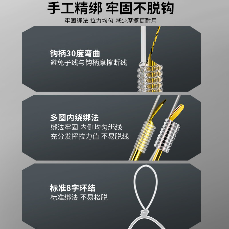 钓鱼专用金袖短子线双钩,采用优质高碳钢材质,经精细淬火工艺打造,钩尖锋利、穿透力强,专为钓鲫鱼设计。金海夕品牌正品保障,钩条适中,刺鱼迅速且不易跑鱼。产品分为有刺与无刺两种款式,满足不同作钓需求:有刺钩防脱钩效果佳,适合野钓复杂环境;无刺钩便于摘钩,适合休闲竞技。短子线设计减少缠绕,提升灵敏度,搭配双钩布局,增加中鱼几率。成品已专业绑制,线结牢固、结节损耗小,开箱即用,省时省力。适用于静水、缓流等多种水域,是钓鲫爱好者的理想选择。