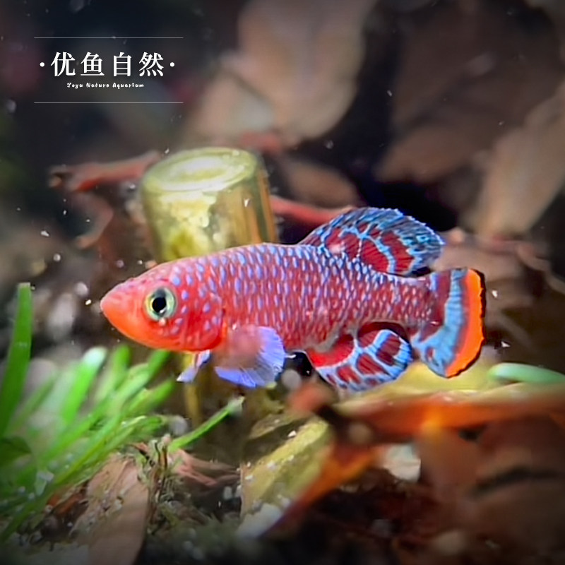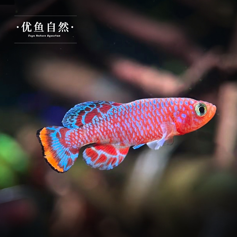 漂亮宝贝鳉(学名:Nothobranchius eggersi),又称贡氏圆尾鳉,是圆尾鳉科的一种热带淡水小型观赏鱼。原产于东非短暂水域,以其绚丽夺目的体色著称,雄鱼体表常呈现亮蓝、橙红与金属绿交织的斑纹,尾鳍圆润如扇,游姿优雅,极具观赏价值。该鱼体型小巧,通常体长3–5厘米,适合小型水族箱饲养。作为一年生鳉鱼,其生命周期较短,但对水质适应力较强,喜弱酸至中性软水。繁殖需模拟雨季环境,卵可耐受干旱,具有独特的生活史。因其色彩鲜艳、形态优美,被誉为“水中宝石”,深受观赏鱼爱好者喜爱。
