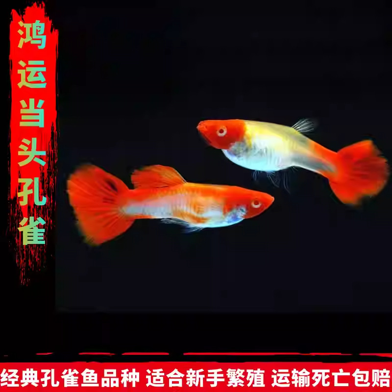 鸿运当头纯种孔雀鱼是一种极具观赏价值的淡水胎生鱼,俗称凤尾鱼,因其色彩艳丽、尾鳍宽大如凤尾而得名。其中“鸿运当头”品种头部呈现鲜艳红色,寓意吉祥,深受鱼友喜爱。该鱼属卵胎生,母鱼直接产出小鱼,无需产卵孵化,繁殖简便,非常适合新手养殖。它们适应力强,对水质要求不高,喜弱碱性至中性软水,适宜水温22–28℃。成鱼体型小巧,约3–6厘米,性格温和,可群养于小型水族箱中。喂食简单,以人工饲料为主,搭配活饵更佳。因其易养、繁殖快、色彩丰富,是入门级观赏鱼的优选之一。