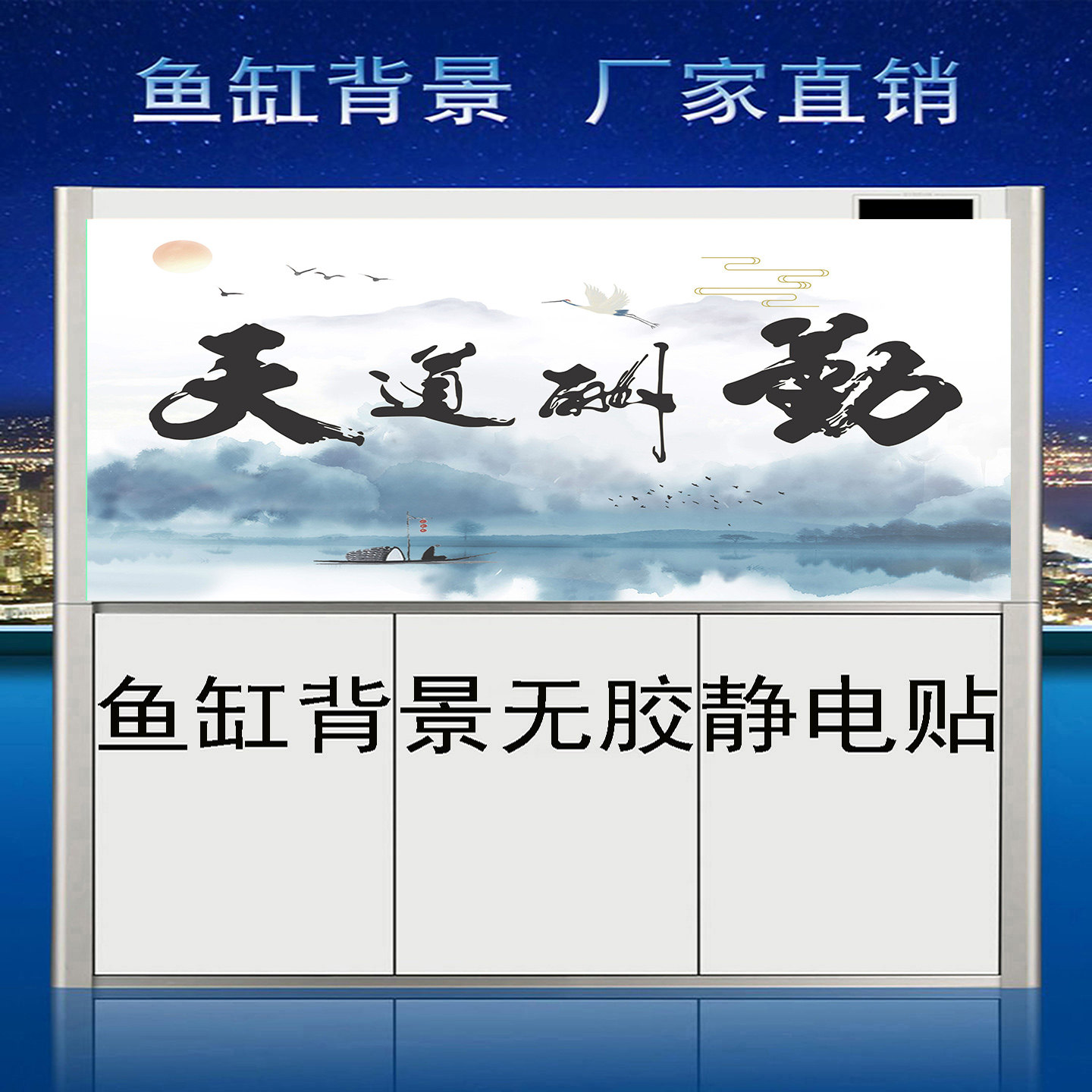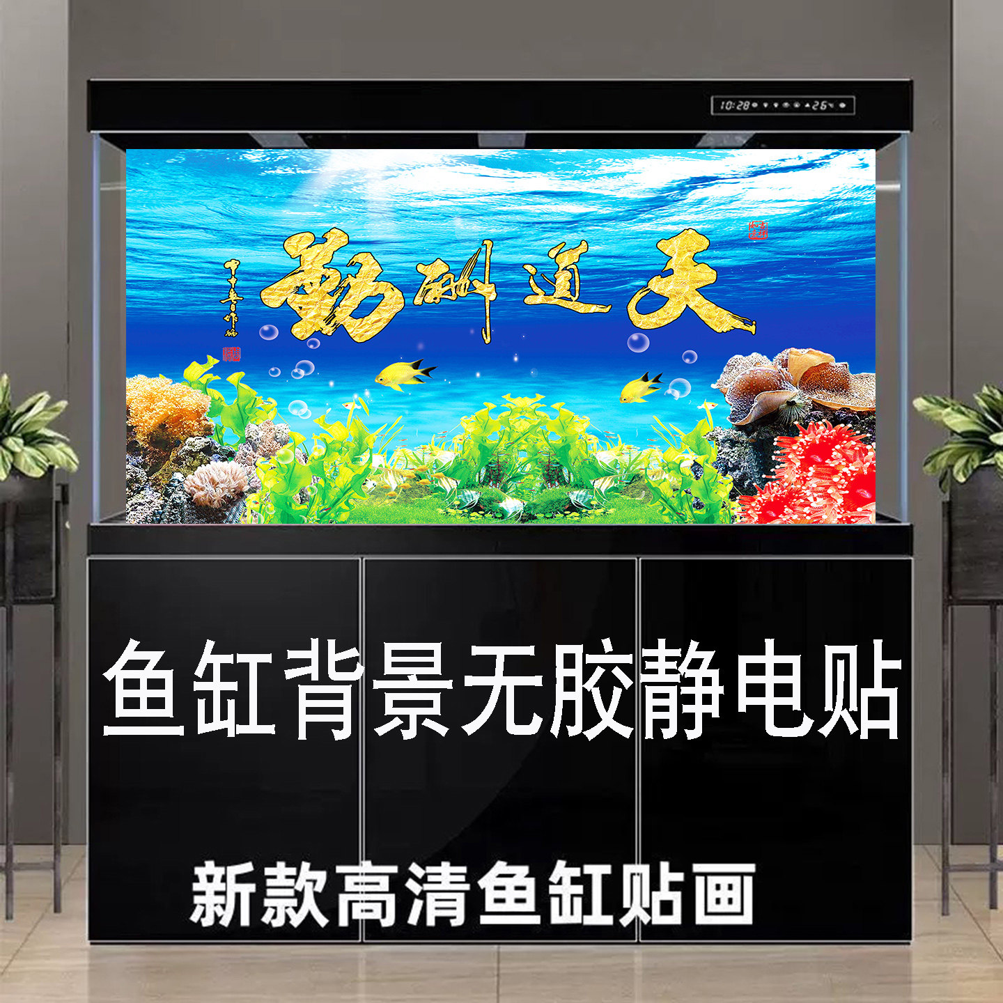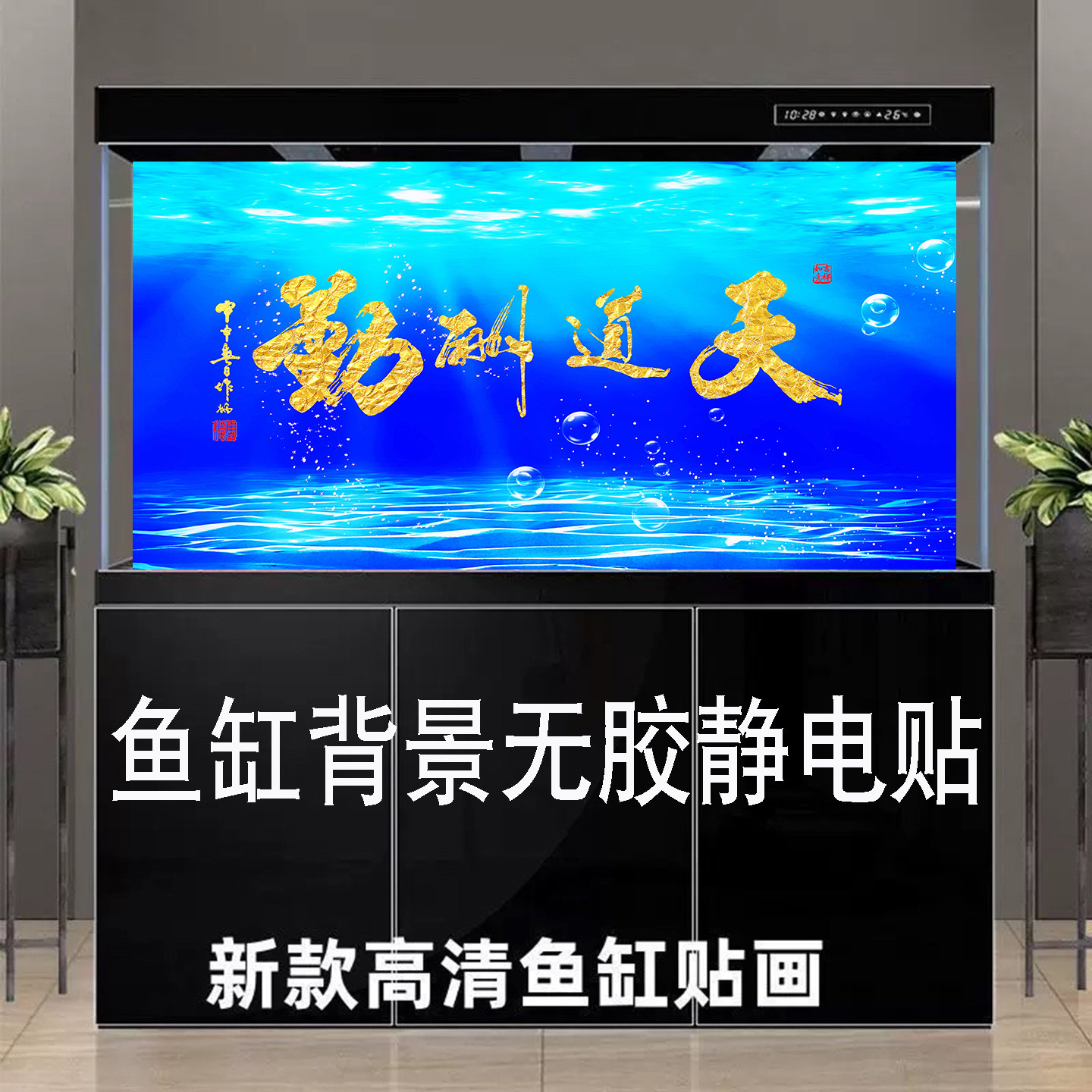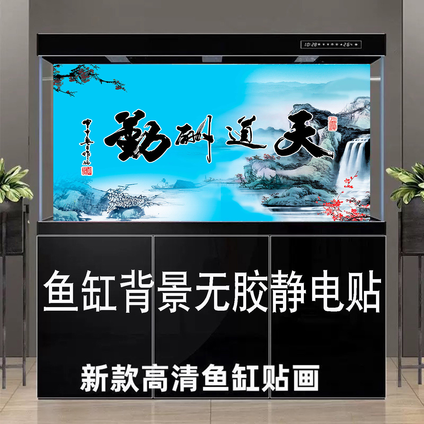 淘宝鱼缸背景贴纸壁纸高清背景画天道酬勤字画外贴喷水贴定制尺寸壁纸