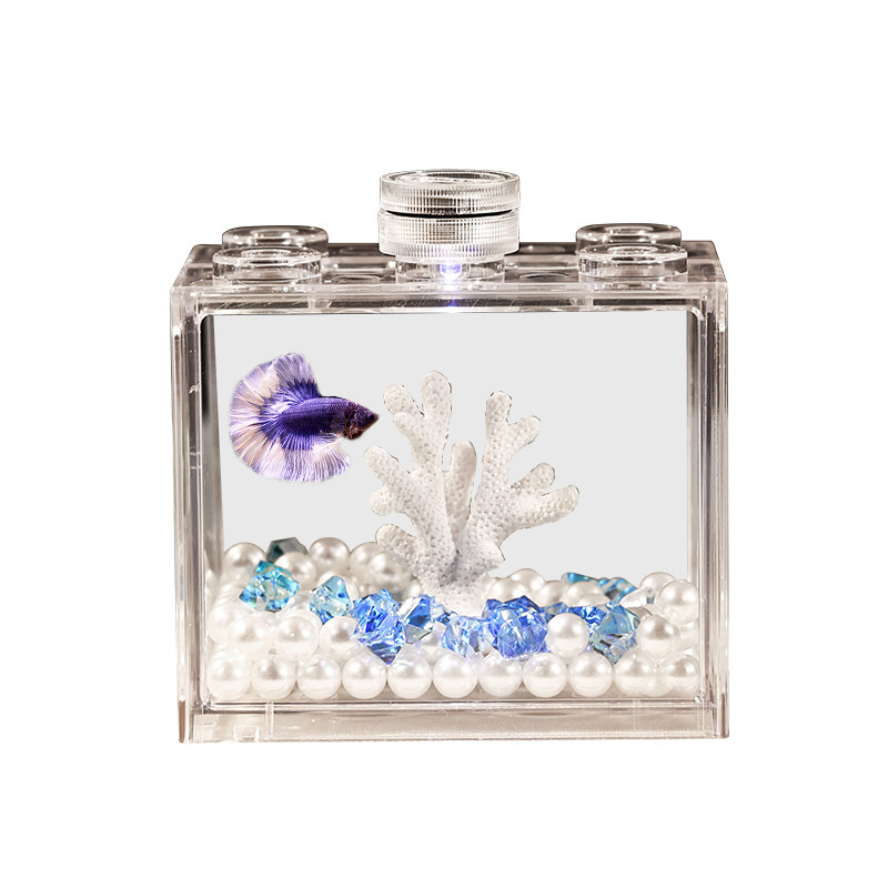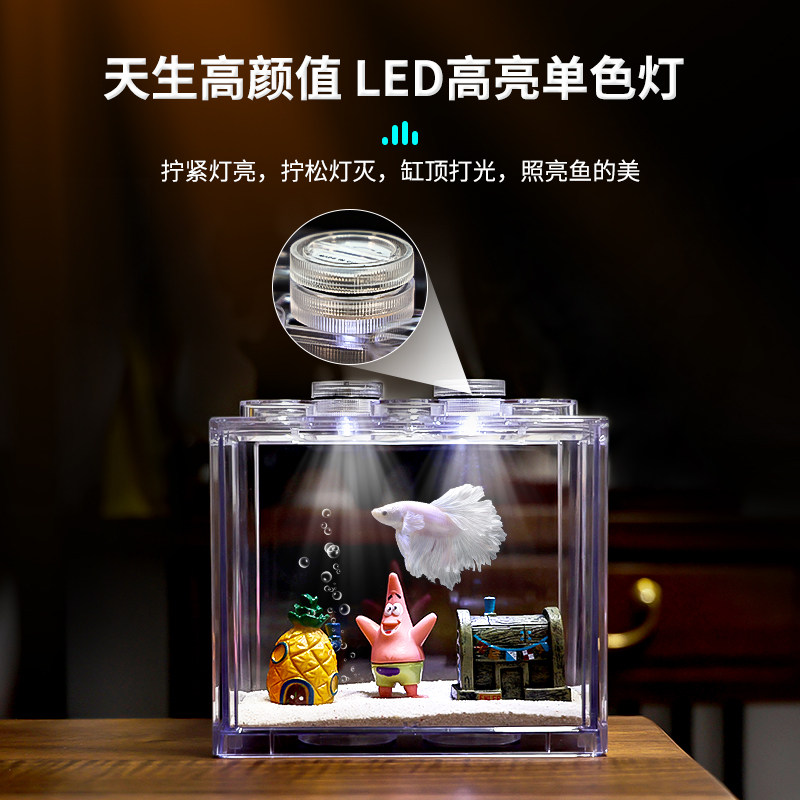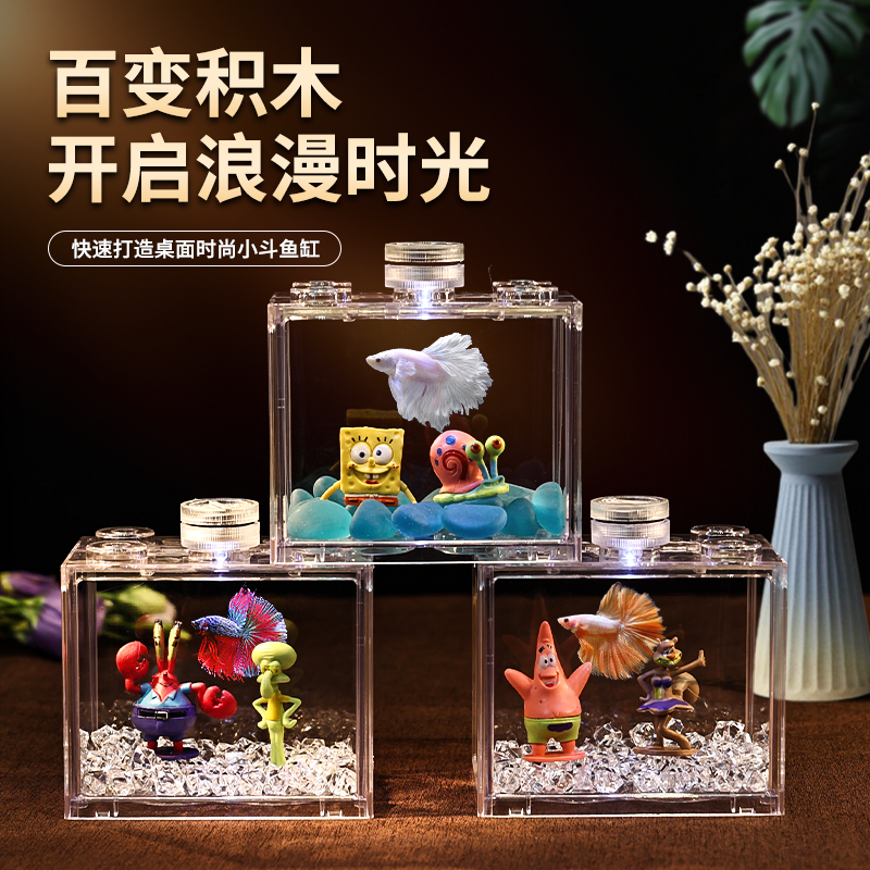 淘宝桌面斗鱼缸小型鱼缸亚克力带灯创意微景观家用积木盒造景全套加厚