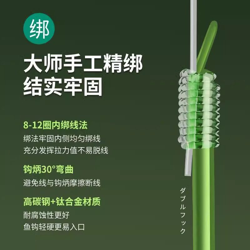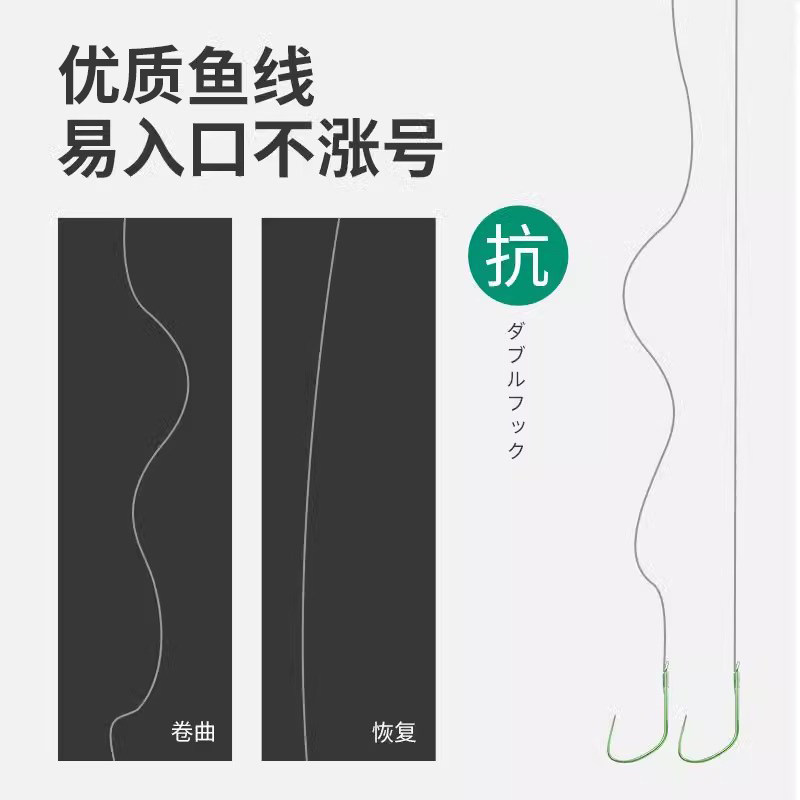 竞技狼牙鱼钩子线双钩成品,专为黑坑垂钓鲫鱼、鲤鱼设计,采用高碳钢材质,钩尖锋利、强度高,确保刺鱼迅速牢固。双钩结构提升中鱼率,搭配优质子线,防缠绕性能优异,有效减少抛投时的打结问题。无刺设计便于摘钩,保护鱼体,适合竞技比赛与休闲垂钓兼顾。线组已预先绑制完成,即拆即用,省时省力,线结牢固,拉力值高,不易脱钩跑鱼。整体工艺精良,正品保障,是钓友征战黑坑、提升渔获的得力助手,兼顾效率与环保,广受垂钓爱好者信赖。