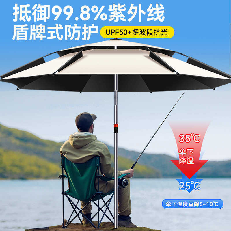新款钓鱼专用伞采用加厚双层设计,具备出色的遮阳、防雨与抗风性能。伞面选用高密度防紫外线涂层,有效阻挡阳光直射,防晒指数高达UPF50+,长时间户外垂钓也能保持清凉舒适。双层伞面结构形成空气对流,减少闷热感,同时增强抗风能力。伞骨采用高强度玻璃纤维与不锈钢材质,坚固耐用,不易折断。配备360°万向调节支架,可自由调整角度,适应不同风向和日照方向。底部配有加重底座或地钉固定装置,稳固防滑,适合沙滩、河边、湖边等多种地形。无论是专业垂钓还是户外摆摊,这款加固加厚的钓伞都是理想的防晒防雨伴侣,实用性与耐用性兼备。