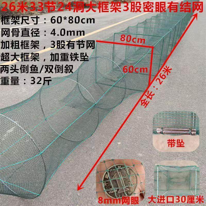 大框架捕鱼笼、虾笼、捕虾网、大地网笼等渔具是传统与现代结合的捕捞工具,广泛应用于淡水及海水捕捞。其结构多采用高强度金属框架搭配有结网衣,网眼设计科学,既能有效困住鱼类、龙虾等水生生物,又减少对幼体的误捕,兼顾效率与生态。此类网笼操作简便,可沉入水底或固定于水流中,利用诱饵吸引目标入笼,进易出难,捕获率高。适用于家庭捕捞、小型渔业及休闲垂钓,尤其在捕捞大鱼、龙虾时表现优异。有结网结构牢固耐用,抗撕裂性强,适合长期使用,是实用性与经济性兼具的优质渔具选择。