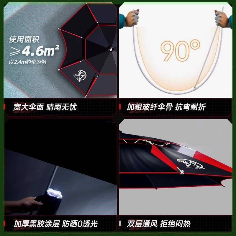 一帆精工新款2.4米钓鱼遮阳伞拐杖双弯机械臂多向调节防雨钓伞
