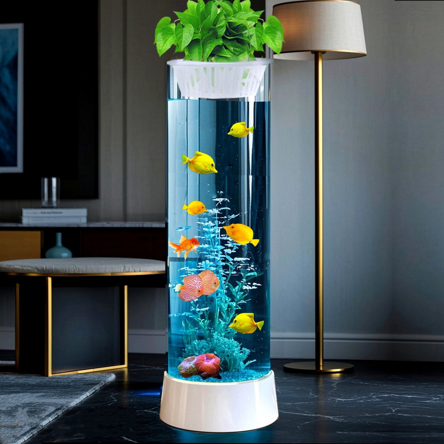 2025年新款圆柱形落地立式免换水生态圆形金鱼缸,专为现代客厅设计,融合美学与科技。采用高透超白玻璃打造,360°全景视野,优雅圆柱造型节省空间又彰显品味。内置智能生态过滤系统,搭配益生菌培菌球与植物根系净化,实现长期免换水,维护轻松。配备LED智能照明,模拟自然光周期,呵护金鱼健康的同时营造梦幻氛围。底部隐藏式储物柜可收纳鱼食与工具,整洁美观。静音水泵与恒温系统确保水质稳定,打造可持续微型生态圈。既是家居装饰亮点,也是安心养鱼的智能选择,让都市生活更添灵动与宁静。