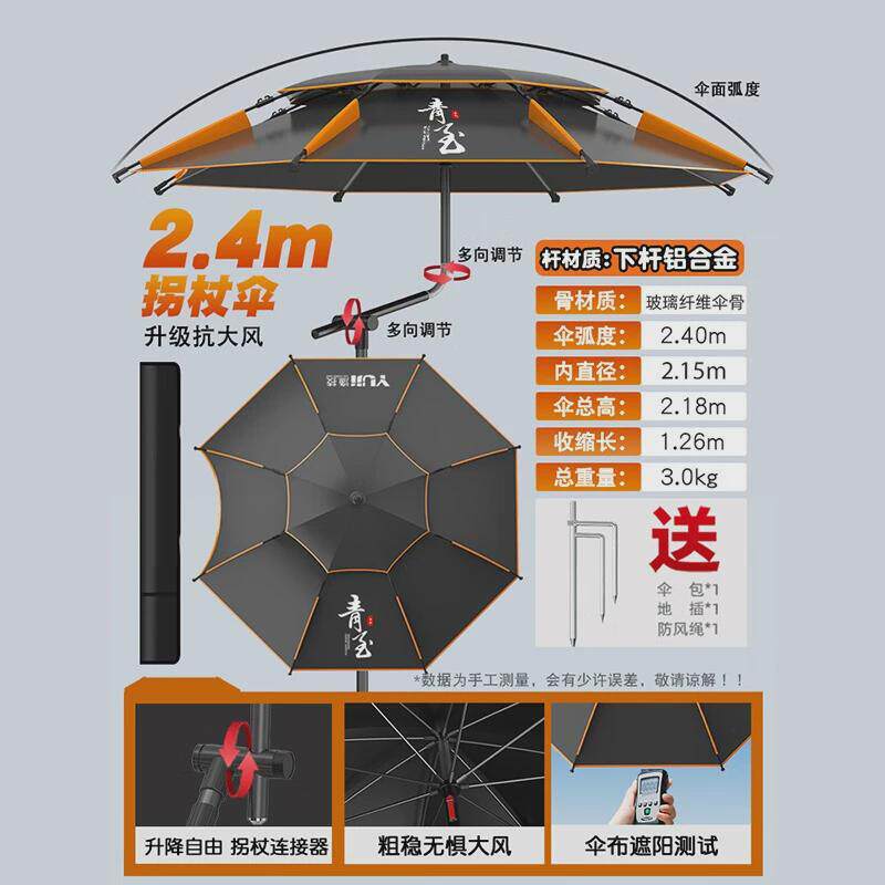 渔技钓伞技渔新款万向户外遮阳伞,专为垂钓爱好者精心设计。采用加厚黑胶涂层伞面,有效阻隔紫外线,防晒防雨双重防护,持久耐用。伞骨选用高强度玻璃纤维材质,抗风稳固,经久不变形。独特的万向调节设计,可360°自由旋转并多角度倾斜,轻松应对不同风向与日照角度,全方位遮阳无死角。伞面直径达2.4米,空间宽敞,适合多人使用或放置钓具。配备专用拐杖式地插,稳固插入泥土或沙地,抗风性能优异。轻便易携,安装快捷,是户外垂钓的理想伴侣,让您尽享舒适垂钓时光。