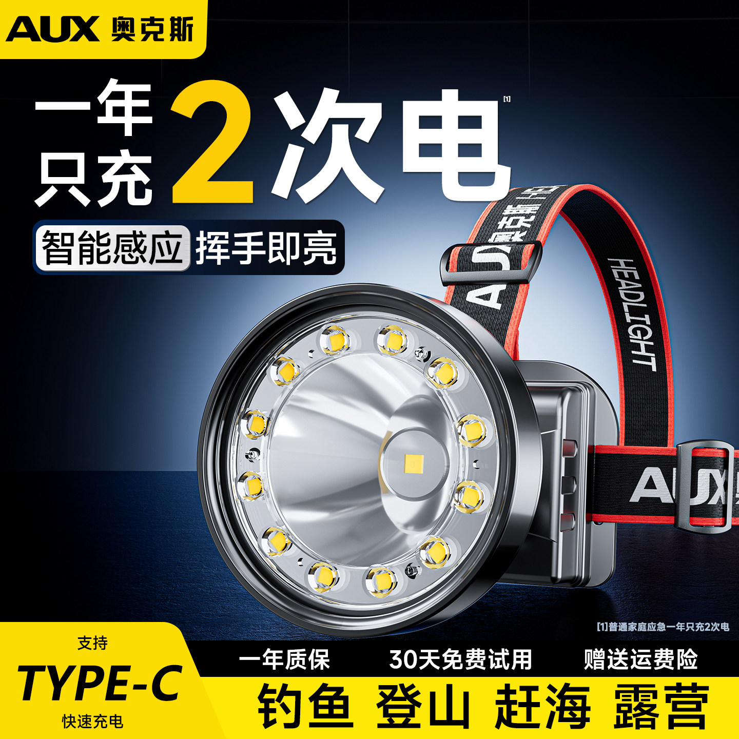 天奥克斯夜钓头灯钓鱼专用帽夹灯超长续航小型感应头戴式强光充电新