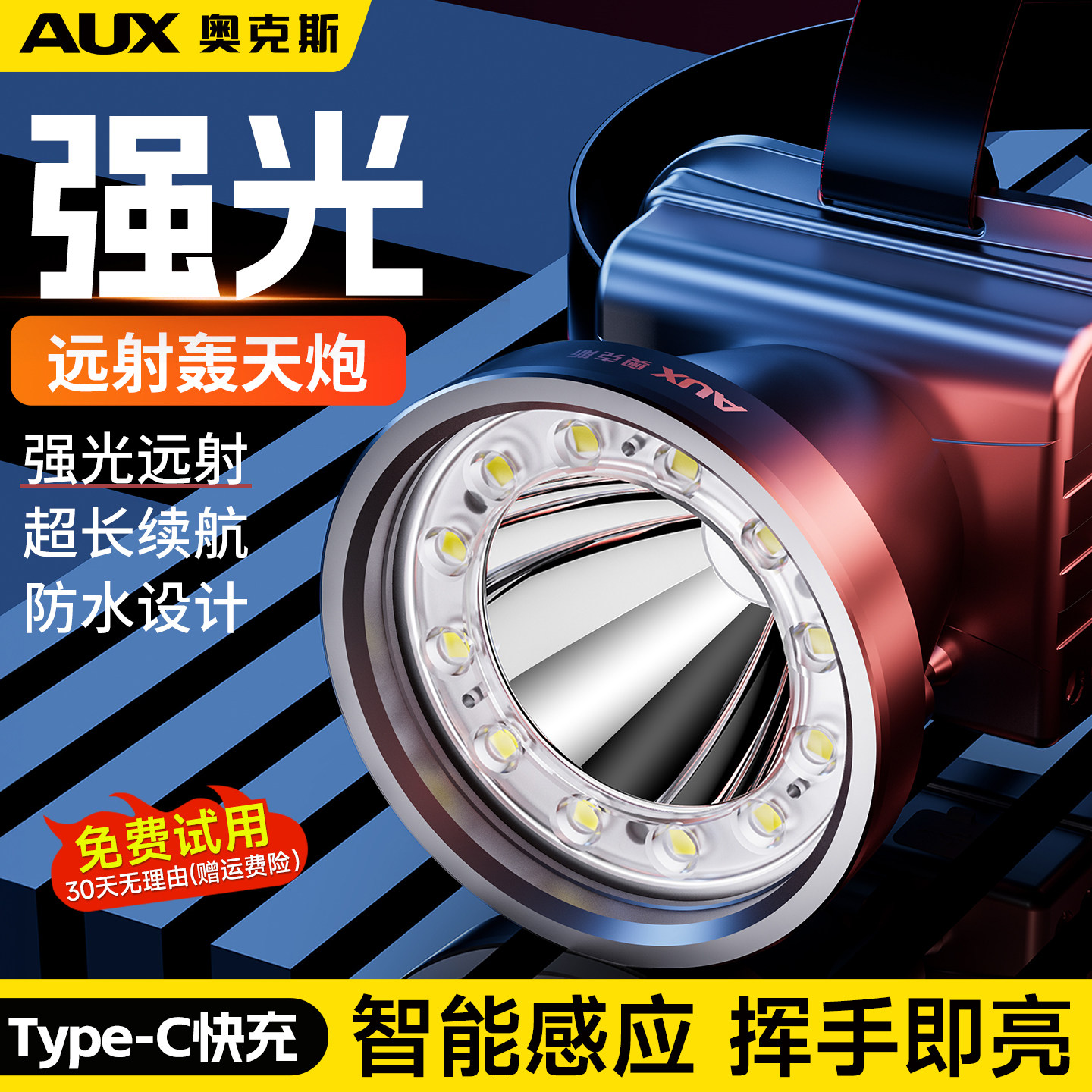 天猫奥克斯强光头灯新款超亮激光大功率头戴式照明长续航钓鱼登山户外