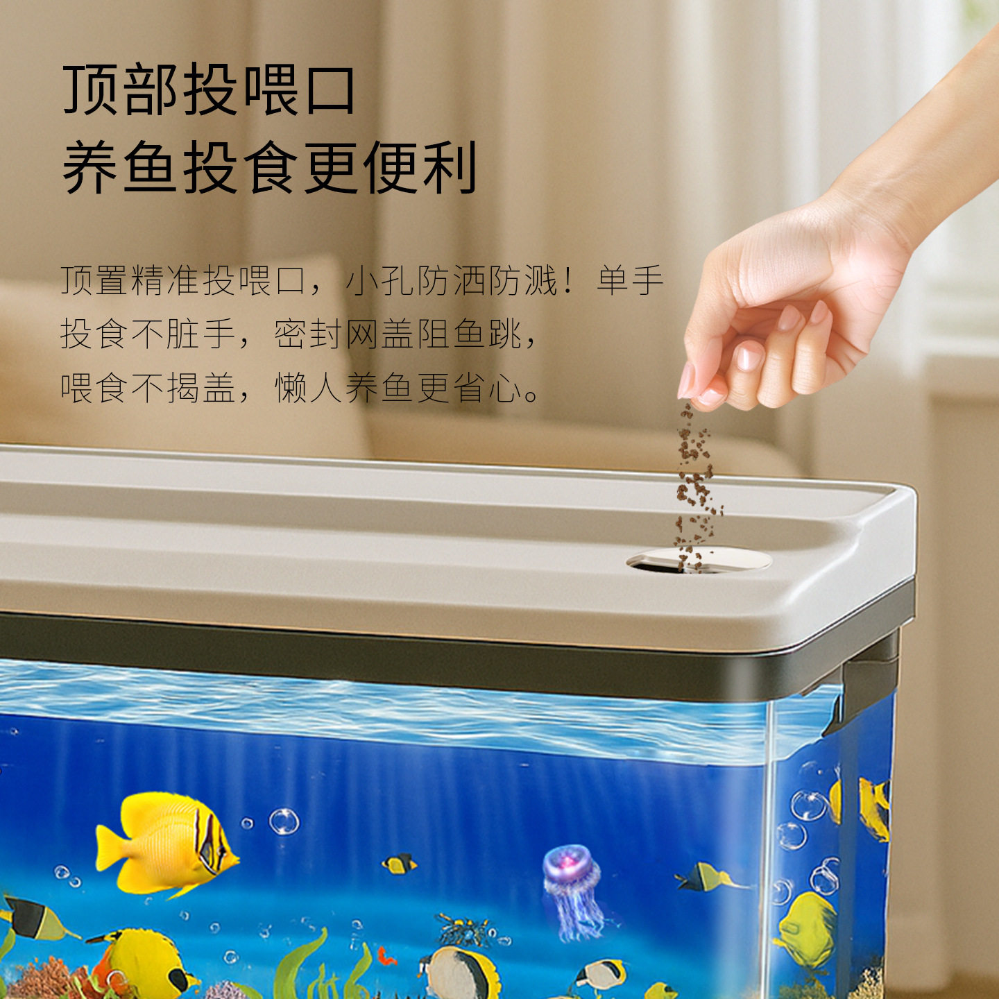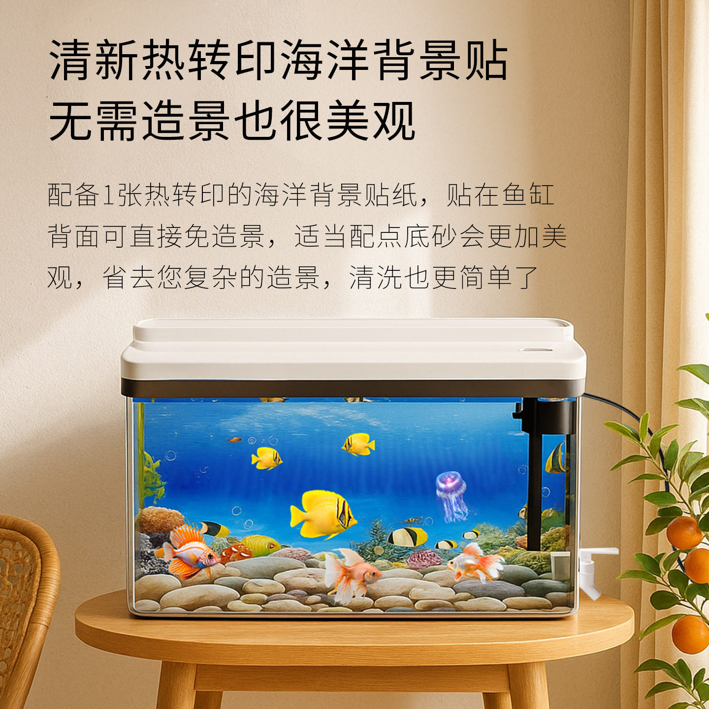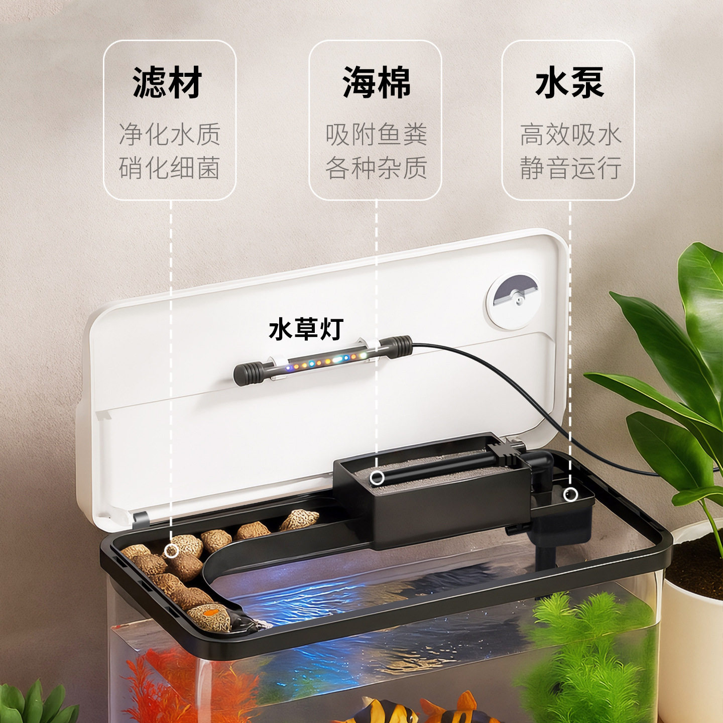 2025年全新推出的鱼缸过滤制氧自循环一体机,专为现代家庭客厅与桌面设计,集智能过滤、静音制氧、生态自循环于一体。采用高效多层过滤系统,有效分解杂质、净化水质,配合纳米曝气技术,持续增氧,营造健康水生环境。创新免换水设计,通过生物菌群平衡与自动补水功能,大幅降低维护频率。搭配LED智能照明与简约美学外观,适配多种家居风格。内置微生态循环系统,实现水质长效稳定,让养鱼更轻松、更环保。无论是观赏鱼、水草还是迷你生态景观,都能在这款水族箱中蓬勃生长,为生活增添一抹自然灵动。
