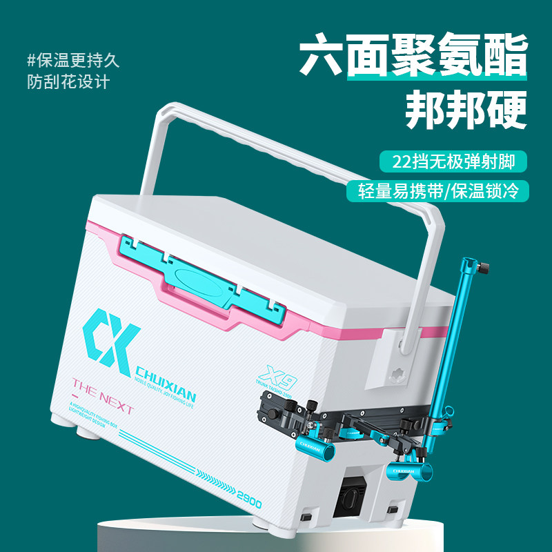 垂弦X9钓箱全新升级,专为台钓爱好者打造,采用免安装设计,开箱即用,极大提升作钓效率。整机超轻材质,重量轻盈却坚固耐用,便于携带。配备全套轨道系统,支持多角度调节,兼容各类钓具配件。拐角炮台设计巧妙,稳固支撑钓竿,操作便捷。箱体结构科学,内置储物空间,可分类收纳饵料、工具等装备。防滑坐垫舒适透气,长时间作钓也不易疲劳。垂弦X9集轻量化、多功能与人性化设计于一体,是休闲垂钓与竞技比赛的理想之选,让每一次出钓都更加轻松高效。