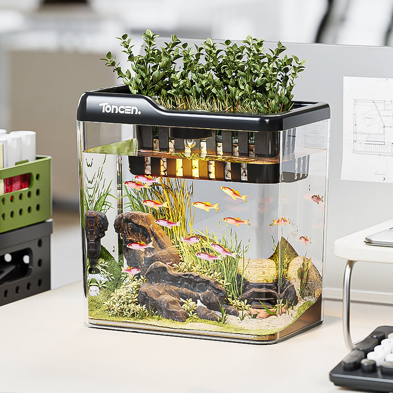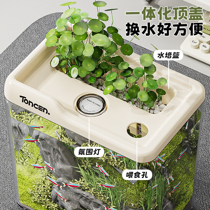 这款桌面生态鱼缸是一款迷你小型高清透明家用水族箱,专为办公桌、书桌或客厅装饰而设计。采用高强度防摔材质,安全可靠,不易破损,适合家庭和办公环境使用。透明度高,视野清晰,可清晰观赏金鱼悠然游动的姿态,增添生活情趣。内置简易过滤系统,保持水质清洁,搭配LED灯光,营造梦幻水下氛围。小巧精致,不占空间,既是实用水族箱,也是精美摆件。支持个性化造景,可搭配水草、砂石等,打造微型生态景观,缓解压力,提升环境美感,是送礼自用两相宜的理想选择。