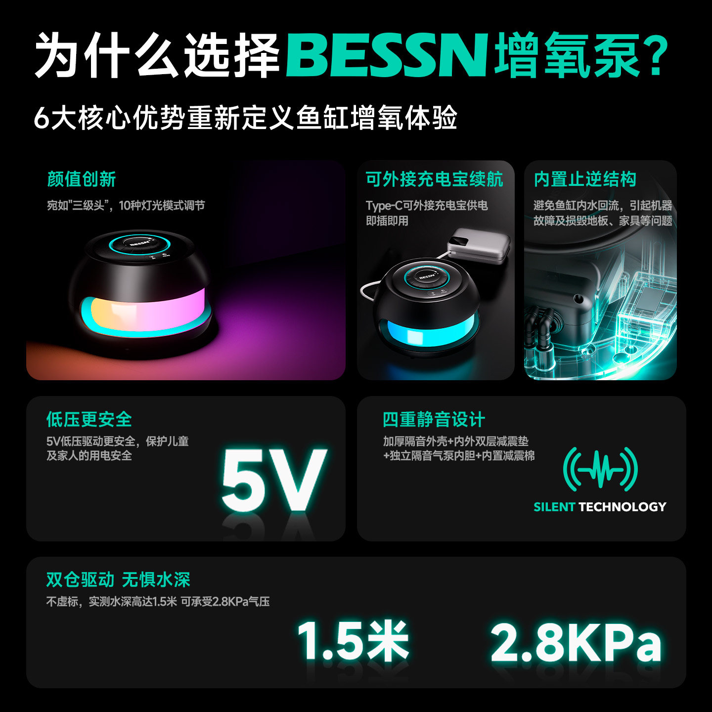 天猫BESSN贝森三级头鱼缸增氧泵家用超静音设计感氛围灯发光打氧气泵