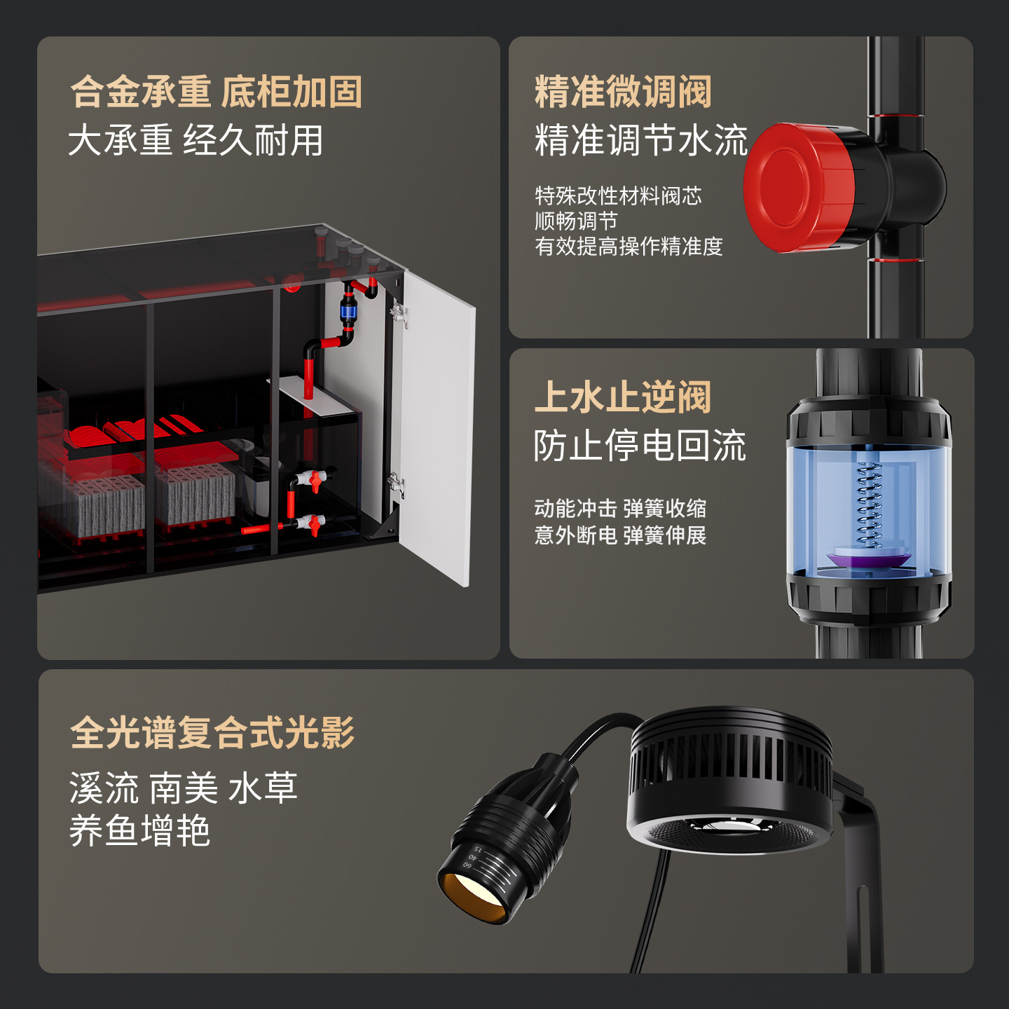 莱易欧2026新款新中式观南金晶超白玻璃鱼缸,融合东方美学与现代工艺,打造客厅底滤水族箱新典范。采用高透金晶超白玻璃,清晰度媲美水晶,呈现极致视觉体验。创新底滤系统高效静音,确保水质洁净稳定。溪流缸设计模拟自然山涧意境,搭配沉木、石材造景,营造宁静禅意空间。新中式风格线条简约雅致,适配现代家居环境,既是生态水族箱,也是艺术装饰品。智能灯光系统还原自然光谱,呵护水草与观赏鱼健康。莱易欧以匠心工艺,为都市生活注入一方灵动水景,悦目养心,静享自然之美。