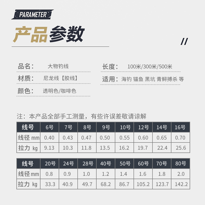 正品300米特粗大号钓鱼线,专为海钓、抛竿、船钓及锚鱼设计,采用高强度优质尼龙材质,具备出色的耐磨、抗拉伸和抗冲击性能。主线与子线均经过精密工艺处理,线体顺滑、结节力强,有效减少断线风险。300米超长长度满足远投和深海作钓需求,线径粗大,承重能力强,适用于钓取大型海鱼。透明或低可见度颜色设计,提升隐蔽性,增加咬钩几率。产品通过严格质检,确保每卷均为正品,是专业钓友海钓、船钓的理想选择,兼顾耐用性与性价比,助您在复杂水域轻松应对各种挑战。