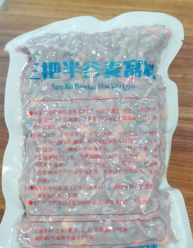 合川钓鱼饵料“三把半谷麦窝料”是一款专为野钓鲤鱼设计的天然五谷杂粮窝料,精选玉米、小麦、高粱、稻谷等多种优质谷物科学配比,经传统工艺发酵处理,香味浓郁持久,能有效吸引并留鱼。特别添加诱食成分,增强适口性,适用于水库、湖泊等自然水域打窝使用。“三把半”指投放量适中,轻松掌握,避免浪费。其沉底快、雾化少,适合长时间守钓,尤其对野生鲤鱼、草鱼等底层鱼类有极强诱惑力。环保无毒,不伤水质,是广大钓友野钓打窝的得力助手,提升中鱼率,享受垂钓乐趣。