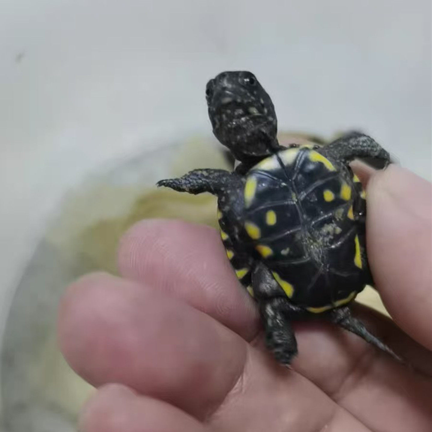 欧泽龟苗,即欧洲泽龟(Emys orbicularis)幼体,是一种体型适中、性情温和的中小型水龟,广泛分布于欧洲及西亚地区。其背甲呈深橄榄色或黑褐色,带有黄色斑点,幼体花纹尤为明显,观赏价值高。欧泽龟适应力强,喜栖息于水草丰茂的淡水环境,适合家庭水族箱或庭院池塘饲养。作为杂食性龟类,幼龟以小鱼、昆虫、水生植物为主食,饲养管理相对简单。因其外形优雅、互动性好,成为深受龟友喜爱的活体观赏宠物。选购时应注意选择活力充沛、无外伤的健康龟苗,并提供适宜的温度、水质与晒背环境,确保其健康成长。