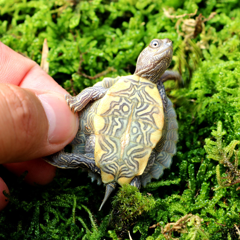 密西西比地图龟(又称地图龟、黑瘤地图龟)是一种极具观赏性的深水龟,原产于北美密西西比河流域。其背甲呈深褐色或黑色,带有精细的黄色或橙色纹路,形似地图,因而得名。头部和四肢常具醒目斑纹,部分个体背甲高耸并带有瘤状突起,观赏价值极高。地图龟性格活泼,适应力强,适合在较大水族箱中饲养,需配备过滤系统和晒背平台。作为杂食性龟类,可喂食龟粮、小鱼虾及蔬菜。因其外形独特、互动性强,成为深受龟友喜爱的小型活体宠物,但需注意水质管理与温度控制,以确保健康生长。