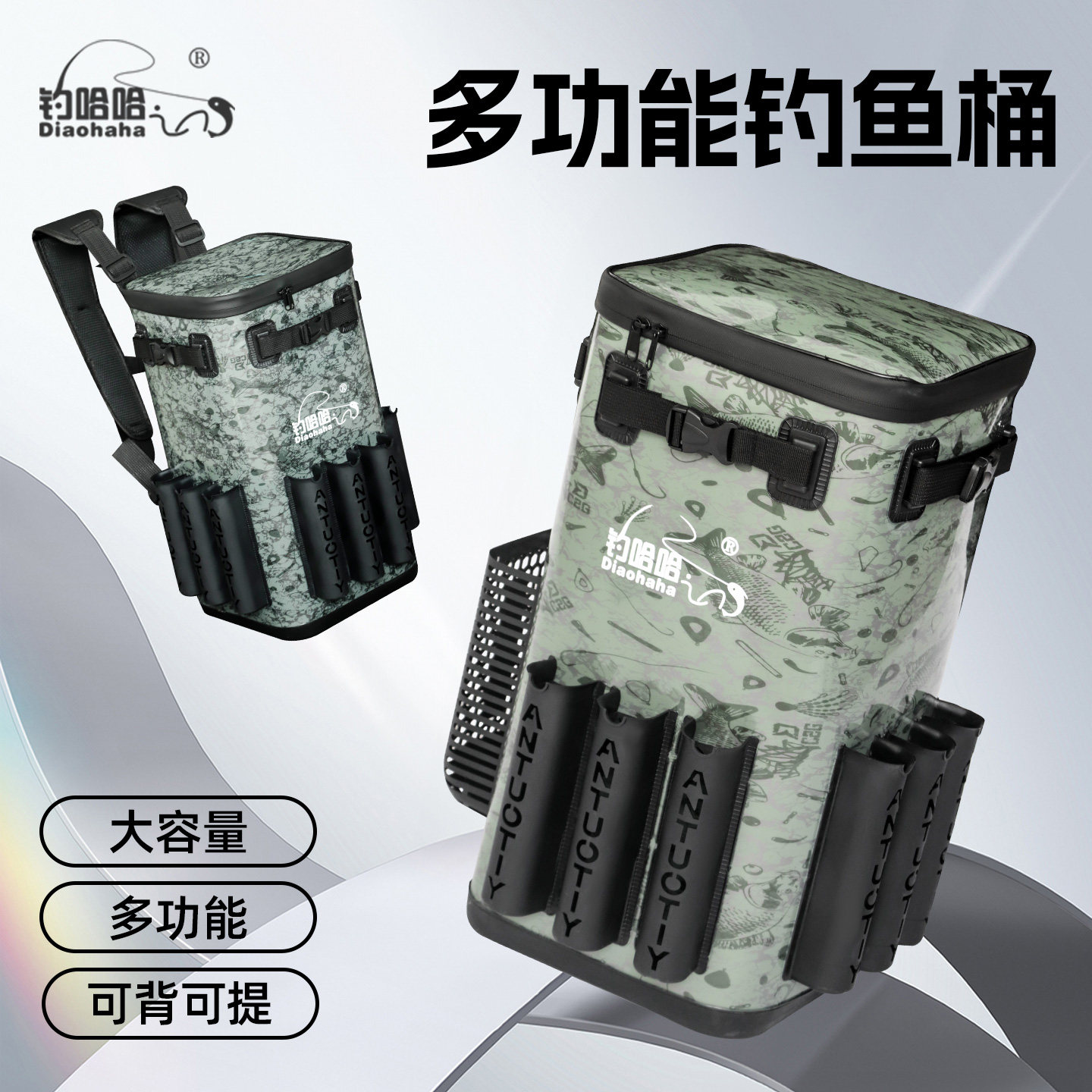 钓哈哈2026新款大容量多功能钓鱼桶包,专为资深钓友设计,采用高强度EVA材质,具备卓越防水性能,有效抵御雨水和溅水,保护装备干燥。双肩背负系统舒适省力,解放双手,适合长途跋涉。包体设有6个独立杆槽,可稳固收纳多根鱼竿,搭配大容量主仓与多个功能口袋,轻松容纳鱼饵、配件、折叠椅等装备。桶式设计便于放置活鱼或冰块,实现储物与保鲜双重功能。整体结构坚固耐用,细节做工精良,是户外垂钓的理想伴侣,兼顾实用性与便携性,让每一次出钓都轻松从容。