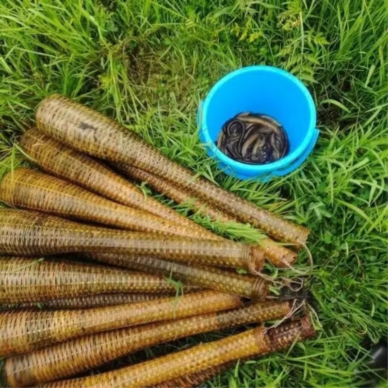 老式竹编倒须喇叭黄鳝笼,是一种传统手工制作的捕鱼工具,采用天然竹篾精心编织而成,结构巧妙。笼身呈喇叭状,入口设有倒须装置,鱼虾、黄鳝、螃蟹等进入后难以逃脱,实现“只进不出”的效果。适用于小河、溪流、稻田等浅水区域,夜间投放,次日收笼,捕获率高且对生态影响小。因其环保、耐用、无需电力,深受老一辈渔民喜爱。如今虽现代化渔具普及,但竹编黄鳝笼仍承载着浓厚的乡土记忆与农耕智慧,是传统渔猎文化的生动体现。