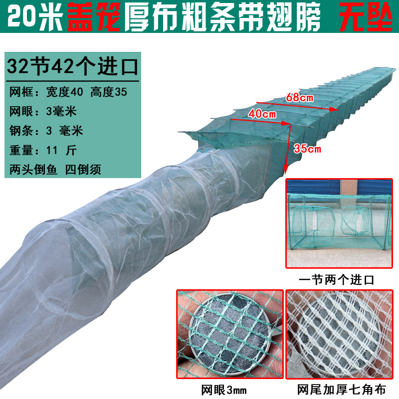 15米×20米大号带翅虾笼鱼笼,专为高效捕捞龙虾、鱼类设计,采用高强度耐磨聚乙烯网布,结构坚固耐用。笼体配备多入口漏斗设计,配合侧翼导流板(带翅),有效引导鱼虾进入并防止逃脱。整体可折叠收纳,便于携带与存放,适合湖泊、河流、池塘等多种水域使用。网眼大小科学合理,兼顾捕捞效率与生态保护。配套专用捕鱼网盖,增强密封性,提升捕获率。适用于专业渔民及休闲垂钓爱好者,是捕捞龙虾、泥鳅、黄鳝等底栖水产的理想工具,操作简单,收放便捷,耐用性强。