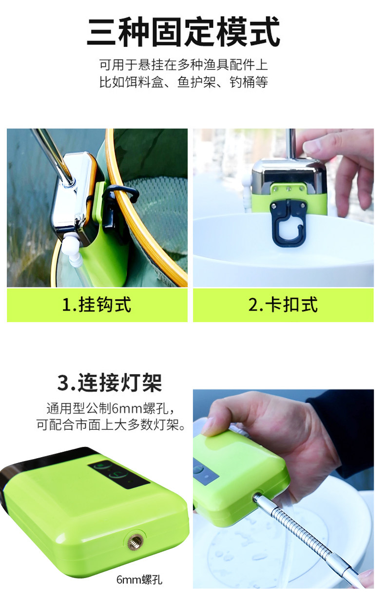 这款钓鱼智能感应取水器是一款专为户外垂钓设计的多功能渔具,集电动抽水、智能感应、增氧泵和洗手功能于一体。采用高效静音电机,可快速从水源抽水,满足钓箱补水、清洗鱼获或洗手等需求。智能红外感应设计,伸手即出水,操作便捷又卫生。内置可充电锂电池,续航持久,适合长时间垂钓使用。同时具备增氧泵功能,有效提升钓箱水体溶氧量,保障活鱼存活率。轻便小巧,安装简单,是钓友提升垂钓体验的实用神器,真正实现一机多用,让户外钓鱼更轻松、更智能。