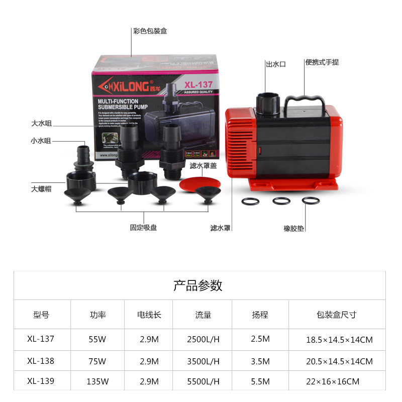 鱼缸潜水泵静音过滤泵是一款专为小型鱼缸、水族箱设计的高效循环设备,兼具抽水、过滤与增氧功能。采用优质静音电机,运行平稳低噪,营造宁静舒适的观赏环境。内置多层过滤系统,有效吸附杂质、净化水质,保持水体清澈健康。体积小、安装简便,可完全 submerged(浸没)使用,节能省电,适合长时间运行。适用于淡水或海水小型水族箱,支持水循环、换水及造流需求,是维持生态平衡、保障鱼类健康的重要配件。无论是新手还是资深鱼友,都能轻松操作,提升养鱼体验。