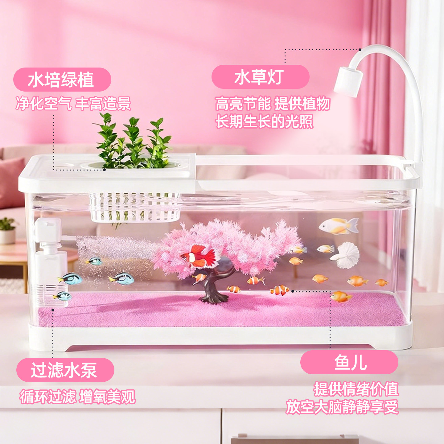 2025年新款家用桌面金鱼缸,集生态造景、智能过滤与静音制氧于一体,专为小型客厅及办公空间设计。采用高透亚克力材质,搭配简约带盖结构,有效防溅防尘,同时营造沉浸式自然景观。内置三重高效过滤系统,结合纳米增氧技术,确保水质清澈、溶氧充足,为金鱼提供健康生活环境。底部LED柔光灯带,可模拟自然光周期,提升观赏美感。智能触控面板支持定时换水提醒与灯光调节,操作便捷。整体小巧精致,占地仅A4纸大小,是现代家居的理想生态装饰,兼顾实用性与美学,让自然之美触手可及。