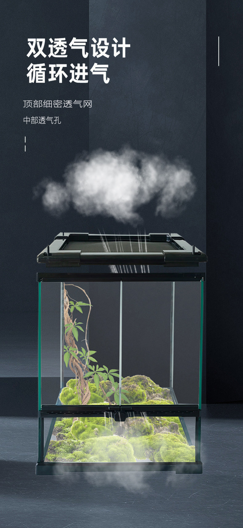 这款玻璃缸雨林缸专为树栖爬宠设计,适用于角蛙、蜘蛛、蜥蜴、睫角守宫等小型爬行动物。采用高透光超白玻璃材质,搭配带盖双开门结构,既保障通风透气,又有效防止宠物逃逸。顶部金属网盖可安装UVB灯、加热灯等设备,模拟自然光照环境。缸体高度适中,利于布置沉木、藤蔓、苔藓等造景,营造逼真的热带雨林生态。底部预留排水层空间,搭配水盆与雾化系统,维持适宜湿度。双开门设计方便日常喂食、清洁与维护,兼顾美观与实用性,是爬宠爱好者打造生态微景观的理想选择。