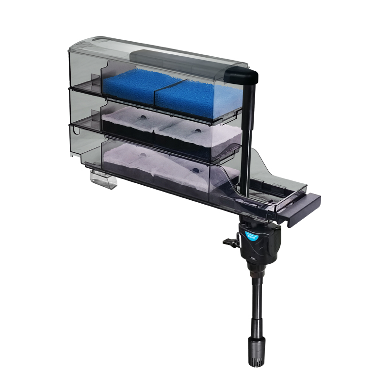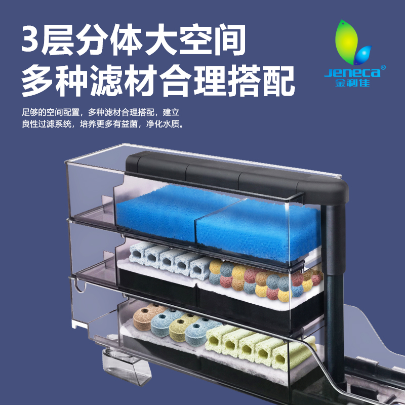 金利佳鱼缸过滤器采用上置长方形滴流盒设计,集过滤、增氧、循环、净水四合一功能于一体,高效提升水质。其挂壁式结构节省缸内空间,安装便捷,适合中小型鱼缸使用。滴流盒多层过滤设计,搭配生化棉、陶瓷环等滤材,有效分解杂质、培养硝化细菌,实现物理与生化双重净化。水流经滴流层充分曝气,显著增加水中溶氧量,促进鱼类健康生长。运行静音,能耗低,维护简单,是提升鱼缸生态环境的理想选择。无论是淡水缸还是水草缸,都能提供清澈稳定的水体环境,让观赏鱼生活更舒适。