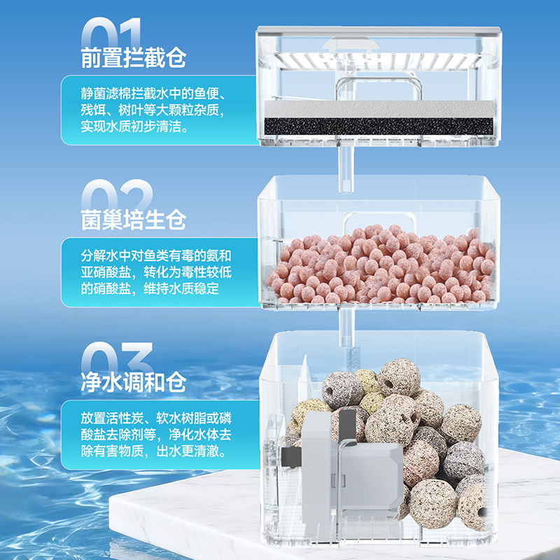 金利佳鱼缸过滤器净水循环系统是一款高效、静音的多功能过滤设备,专为观赏鱼养殖设计。该系统采用干湿分离周转箱结构,搭配高性能水泵和滴流盒设计,有效提升水体含氧量与过滤效率。通过物理、生物双重过滤,强力去除杂质、培养硝化细菌,实现水质长效清澈稳定。模块化设计便于清洗维护,适配不同尺寸鱼缸。其静音运行、低能耗特性,兼顾环保与实用性,是水族爱好者打造健康生态鱼缸的理想选择,广泛应用于家庭、办公室及专业水族箱场景,保障鱼类健康生长。