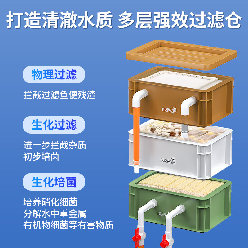 森森陶瓷缸鱼缸周转箱过滤器是一款专为圆缸、龟缸及周转箱设计的三合一净水循环过滤系统。采用高效滴流过滤技术,结合物理、生物双重过滤方式,有效分解水中杂质与有害物质,保持水质清澈稳定。内置多层过滤槽,可灵活填充陶瓷环、生化棉等滤材,培养有益硝化细菌,提升水体自净能力。结构紧凑,安装简便,适用于小型鱼缸、龟缸及临时周转场景。静音运行,节能低耗,兼顾实用性与美观性,是水族爱好者维护水质的理想选择,特别适合需要高溶氧、强过滤的饲养环境。
