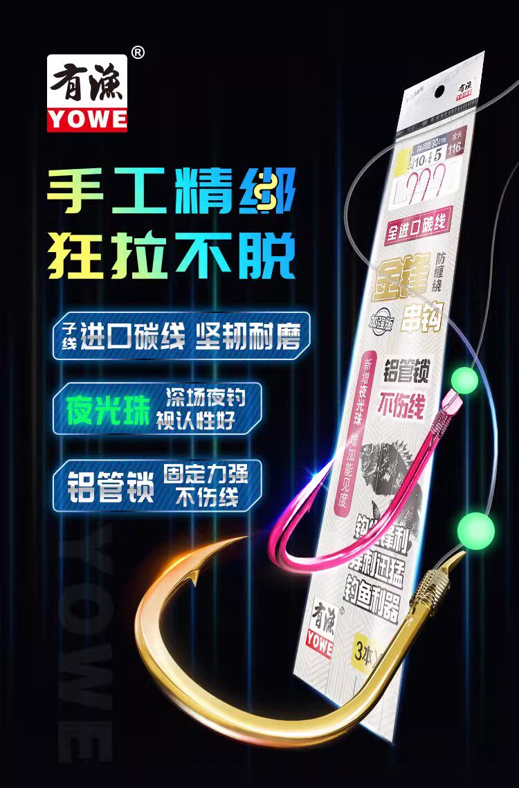 矶工坊防缠绕串钩钓组专为船钓、矶钓设计,采用高品质BKK千又钩,钩尖锋利、强度高,有效提升刺鱼成功率。钓组结构科学,配备防缠绕主线与子线,大幅减少抛投和收线时的缠绕问题,提升作钓效率。手绑工艺精细,结节牢固,确保受力均匀,不易脱钩。适用于海竿、船钓等多种场景,可 targeting 多种海鱼如黑鲷、黄鸡鱼、石斑等。整体轻便耐用,防腐性能优异,是海钓爱好者提升渔获的可靠选择。无论是新手还是资深钓友,都能轻松上手,享受高效垂钓乐趣。