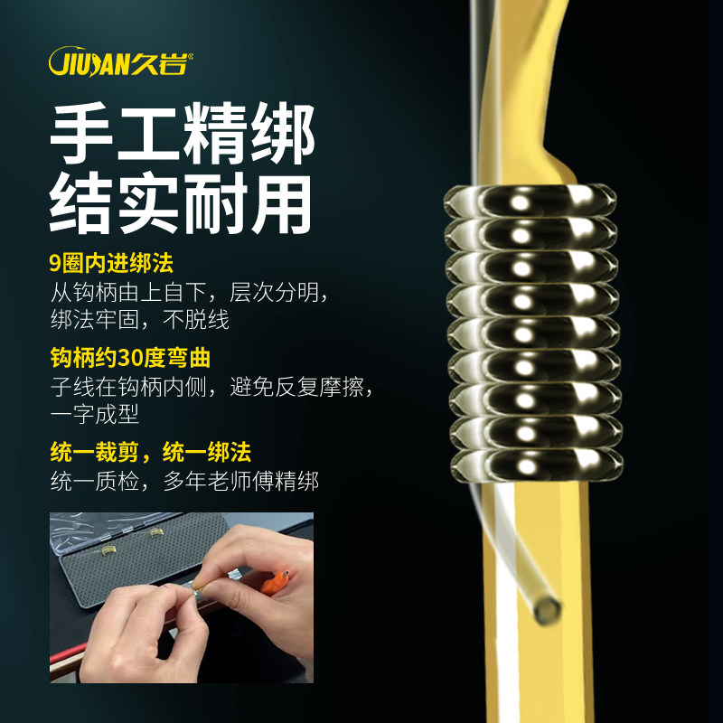 久岩35cm短子线金袖双钩成品钩,专为钓鲫鱼等小型鱼类设计,采用优质高碳钢打造,钩尖锋利、穿透力强,且具备良好韧性不易变形。子线长度适中,搭配无倒刺金袖钩,有效减少对鱼的伤害,提升放生存活率,同时降低挂底风险。双钩设计增加中鱼概率,尤其适合在草边、障碍物较多的水域作钓。线组已专业绑制,结节牢固,出线顺畅,即拆即用,省时省力。久岩品牌保障,正品品质,是休闲野钓、黑坑糗鱼的得力助手,特别适合追求精细作钓的钓友使用。