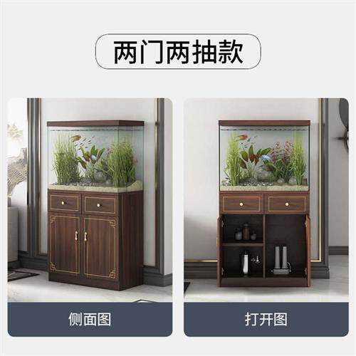 淘宝新中式鱼缸柜实木底柜超白缸海缸地柜带抽屉描金水族箱水草缸架子