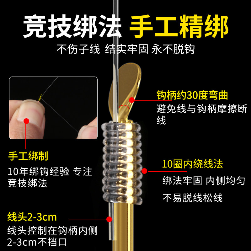进口细条袖钩金袖绑好子线双钩钓鱼钩鲫鱼专用套装,采用优质高碳钢材质,经精密锻造与镀金工艺处理,防锈耐磨,钩尖锋利,穿透力强。专为垂钓鲫鱼设计,钩条细、重量轻,有效降低鱼儿警觉性,提升咬钩率。子线已提前绑制完成,采用高强度进口鱼线,结节牢固,搭配双钩设计,增加中鱼概率。整套产品包含多种规格,适配不同水域与鱼情,开袋即用,方便快捷。正品保障,品质可靠,是休闲垂钓与竞技作钓的理想选择,尤其适合追求精细作钓的钓友使用。
