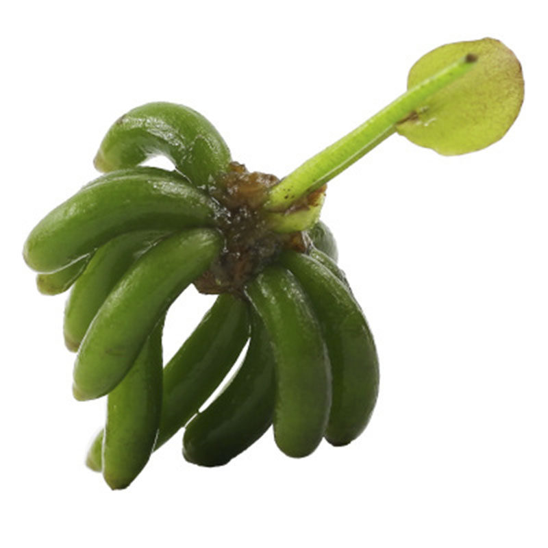 香蕉草(学名:Nymphoides aquatica),又称结蕉草,是一种稀有且极具观赏价值的前景水草。其独特之处在于根部形似香蕉,富含养分,无需种植于底砂中,可直接漂浮或轻压于水中生长,堪称“懒人草”。水中叶片小巧翠绿,呈心形,排列紧凑,能快速形成茂密绿毯,为水族箱增添自然野趣。适应性强,对光照和水质要求不高,适合新手造景。作为活体水草,香蕉草还能吸收水中硝酸盐,净化水质。因其稀有性和独特美感,成为水草造景中的亮点,是打造简约自然风格鱼缸的理想选择。