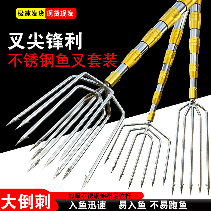 淘多功能大倒刺老式捕鱼叉不锈钢鱼叉头伸缩杆渔叉鱼插鱼叉子大全