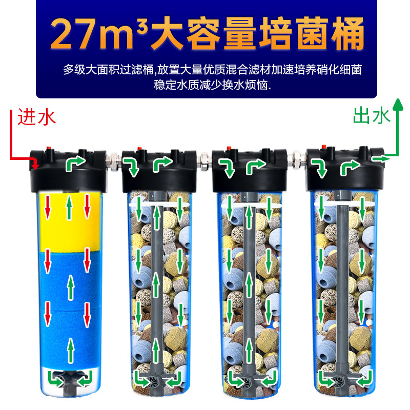 大型鱼池、鱼缸过滤桶及水族箱外置净水循环过滤系统,专为草缸、生态缸及大型观赏水体设计,高效实现水质净化与生态平衡。该系统采用多层物理、生物过滤结构,有效去除杂质、分解氨氮,保持水体清澈透明。外置式设计节省缸内空间,安装便捷,运行安静。内置高性能水泵,提供稳定水流循环,兼具增氧功能,促进有益菌群繁殖,提升鱼类与水生植物的健康生长环境。适用于淡水、海水等多种水体,是打造生态稳定、低维护水族环境的核心设备,广泛应用于家庭、办公及商业展示场景,让水族养护更轻松、观赏更舒心。