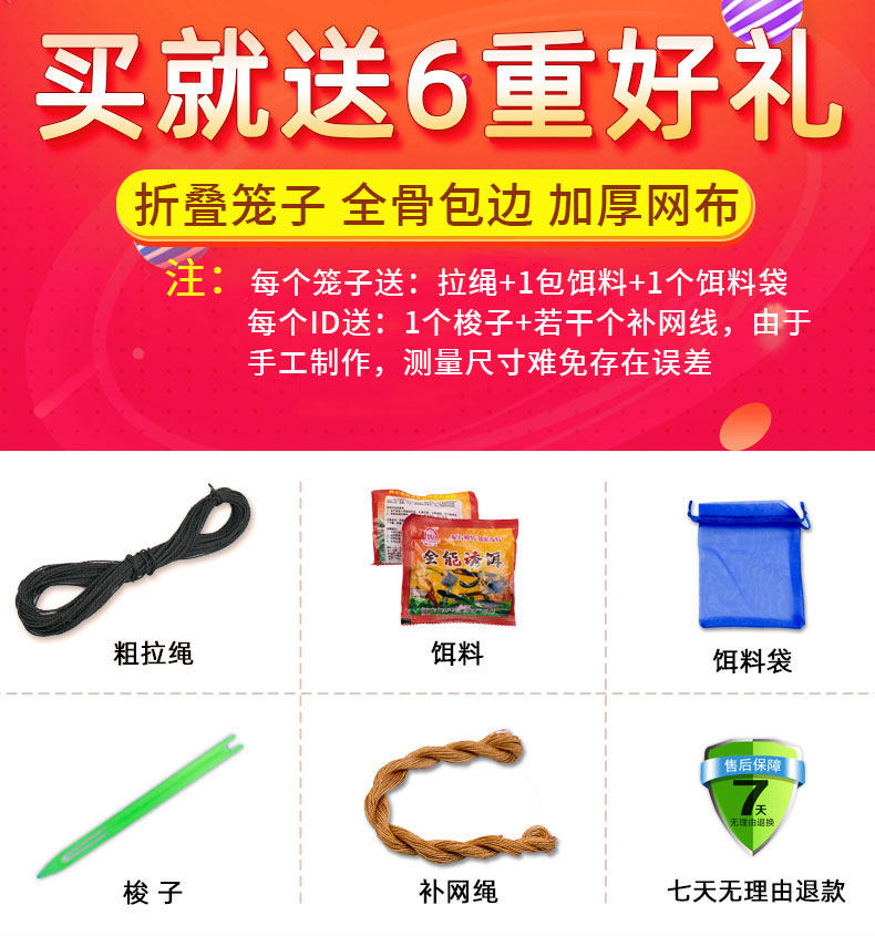 这款加厚自动捕鱼工具是一款高效实用的折叠式虾笼渔网,专为捕捉河虾、泥鳅、黄鳝、龙虾等淡水水产设计。采用高强度耐磨材料制成,网眼细密、结构牢固,有效防止猎物逃脱。笼体设计科学,内置诱饵仓和单向入口,鱼类进入后难以退出,实现自动捕捞。整体可折叠收纳,轻便易携带,适合河流、湖泊、池塘等多种水域使用。无论是休闲垂钓还是小规模捕捞,都能轻松应对。操作简单,无需电力,环保又省力,是渔友和农户的理想选择。耐用、高效、便携,助您轻松收获满笼鲜味。
