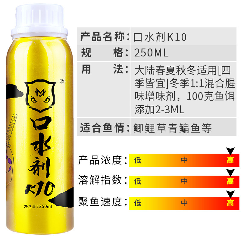 穿透王新品口水剂K10是一款专为鲤、鲫、青鱼、草鱼、鳊鱼等淡水鱼种设计的高端诱鱼剂。采用独特生物活性配方,融合天然诱食成分与高效扩散技术,入水后迅速释放强烈气味分子,穿透力强,持久留窝,显著提升鱼饵吸引力。K10模拟鱼类摄食时的“口水信息素”,激发鱼类觅食本能,有效打破鱼类警惕性,适用于黑坑、湖库等多种垂钓环境。本品无色透明、不伤手、不污染水体,兼容各类粉饵与颗粒,是进阶钓友提升渔获的得力助手。穿透王K10,以科技赋能垂钓,让诱鱼更高效、作钓更轻松。
