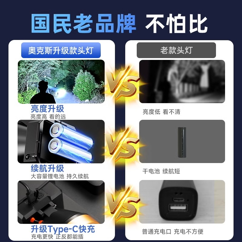 奥克斯头灯户外登山新款强光超亮充电感应钓鱼专用头戴式夜跑小型