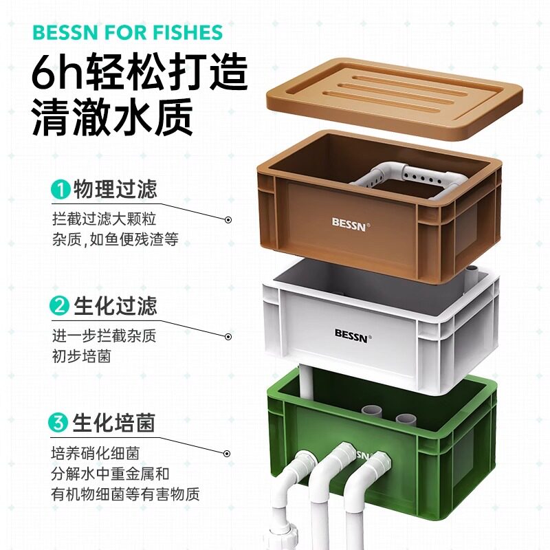 BESSN内置水泵周转箱过滤箱是一款高效、静音的水循环过滤系统,专为鱼缸、鱼池设计。采用多层滴流过滤结构,搭配优质滤材(如生化棉、陶瓷环等),有效分解氨氮、净化水质,提升水体溶氧量。内置静音水泵,动力强劲且能耗低,实现水体持续循环。周转箱式设计便于安装与维护,结构稳固、耐腐蚀,适用于淡水及海水环境。紧凑外观节省空间,适合家庭、办公室及庭院鱼池使用。BESSN过滤器兼顾美观与实用性,为水生生物营造健康、清澈的生存环境,是水族爱好者理想的过滤解决方案。