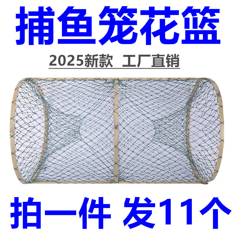 花篮鱼笼是一种传统而高效的捕鱼工具,采用圆形两头通设计,结构轻巧,便于投放与回收。主体由韧性竹条或高强度塑料编织而成,网眼细密,适合捕捉鲫鱼、黑鱼、甲鱼等底层鱼类。其独特自动折叠功能,使用时展开,空置时可快速收拢,节省空间,便于携带。鱼笼两端设有倒须入口,鱼类易进难出,提高捕获率。适用于河流、湖泊、池塘等静水或缓流水域,环保无污染,可持续使用。花篮鱼笼兼具实用性与经济性,是渔民和垂钓爱好者常用的捕捞器具,广泛用于家庭捕捞与小型渔业生产。