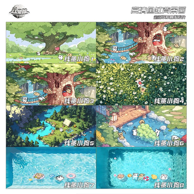 淘宝鱼缸背景纸画高清图3d立体线条小狗卡通可爱水族箱贴纸造景装饰