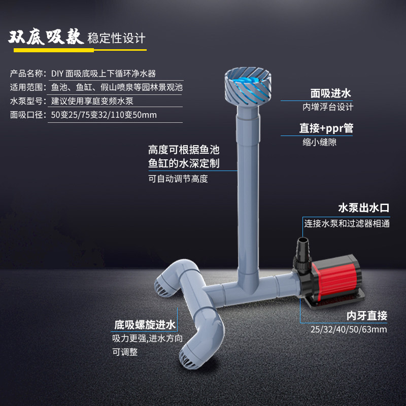 鱼池鱼缸静音可调节水泵改底吸面吸一体神器过滤头浮头油膜收集器