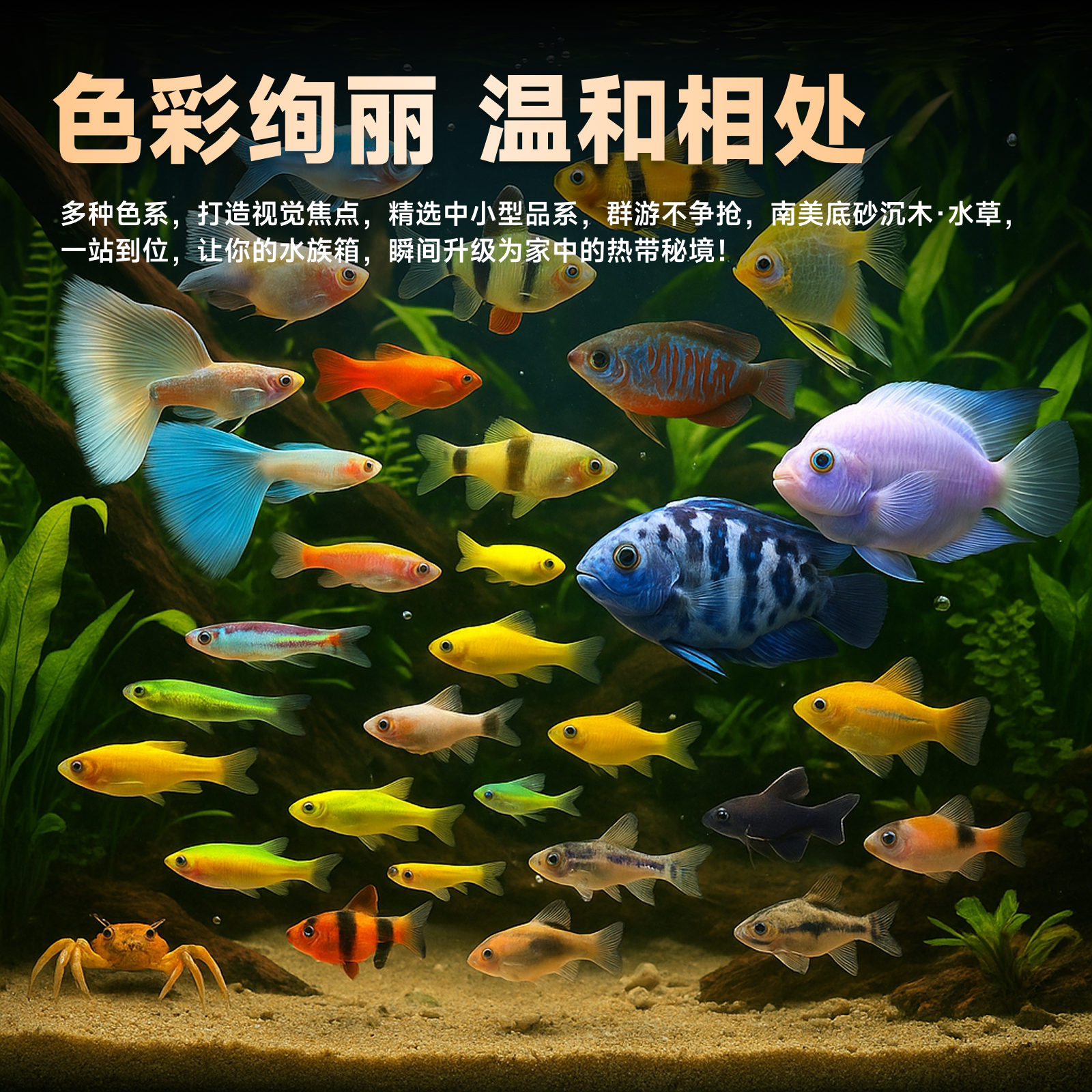 斑马鱼、孔雀鱼、金鱼、灯科鱼(如红绿灯鱼)是常见的小型淡水观赏鱼,适合初学者饲养。斑马鱼活泼好动,适应力强,对水质要求不高;孔雀鱼色彩艳丽,繁殖力强,喜温暖水质;金鱼为经典冷水鱼,耐寒性强,适合庭院鱼池或大型鱼缸;红绿灯鱼体色鲜艳,群游效果佳,喜弱酸软水。这些鱼类多为杂食性,喂食简单,日常管理轻松。其中金鱼和斑马鱼更耐低温,适合冷水环境,而孔雀鱼和灯科鱼偏好24–28℃水温。整体而言,它们体型小巧、性格温和,是打造美观生态水族箱的理想选择,兼具观赏性与易养性。
