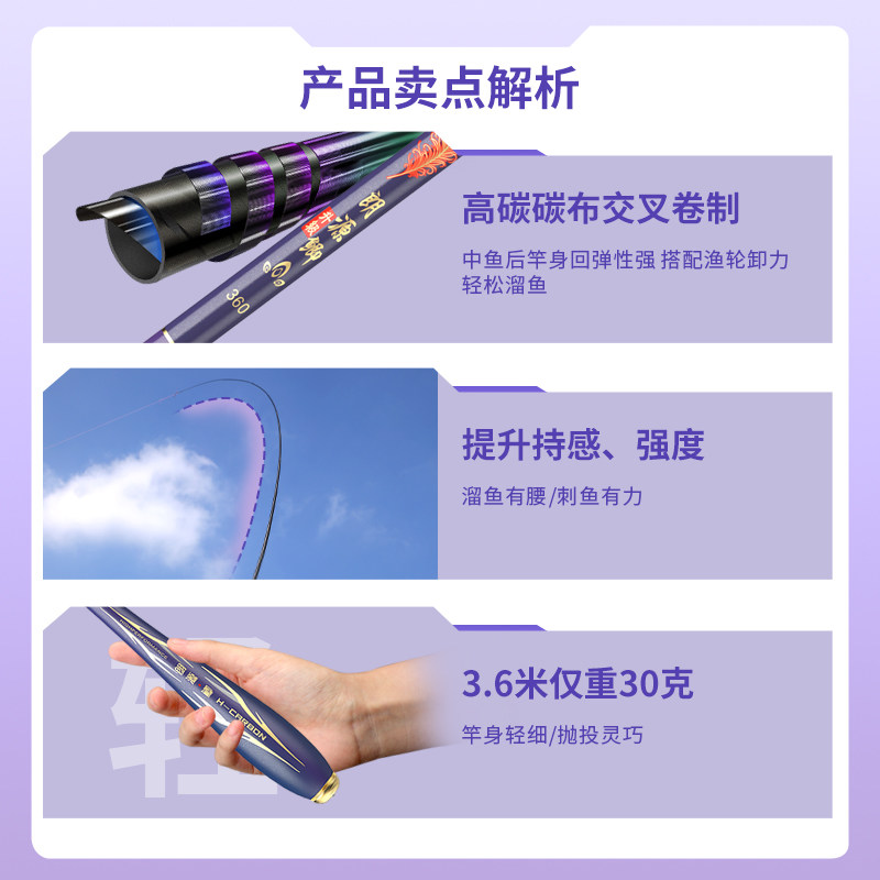 这款鱼竿专为台钓设计,主打轻量化与高强度结合,采用高碳素材打造,超轻超细的竿身设计,长时间作钓不累手。提供19调、28调、37调多种调性选择,满足不同鱼情需求:19调超硬,适合快速起鱼;28调小综合,兼顾灵敏与韧性;37调偏软,护线护竿,尤其适合垂钓鲫鱼等小型鱼种。竿体韧性强,腰力足,抛投精准,信号传递清晰。无论是野钓、黑坑还是竞技,都能轻松应对。精致导环、舒适握把,细节考究,是休闲与实战兼备的优质手竿,为钓友带来极致垂钓体验。