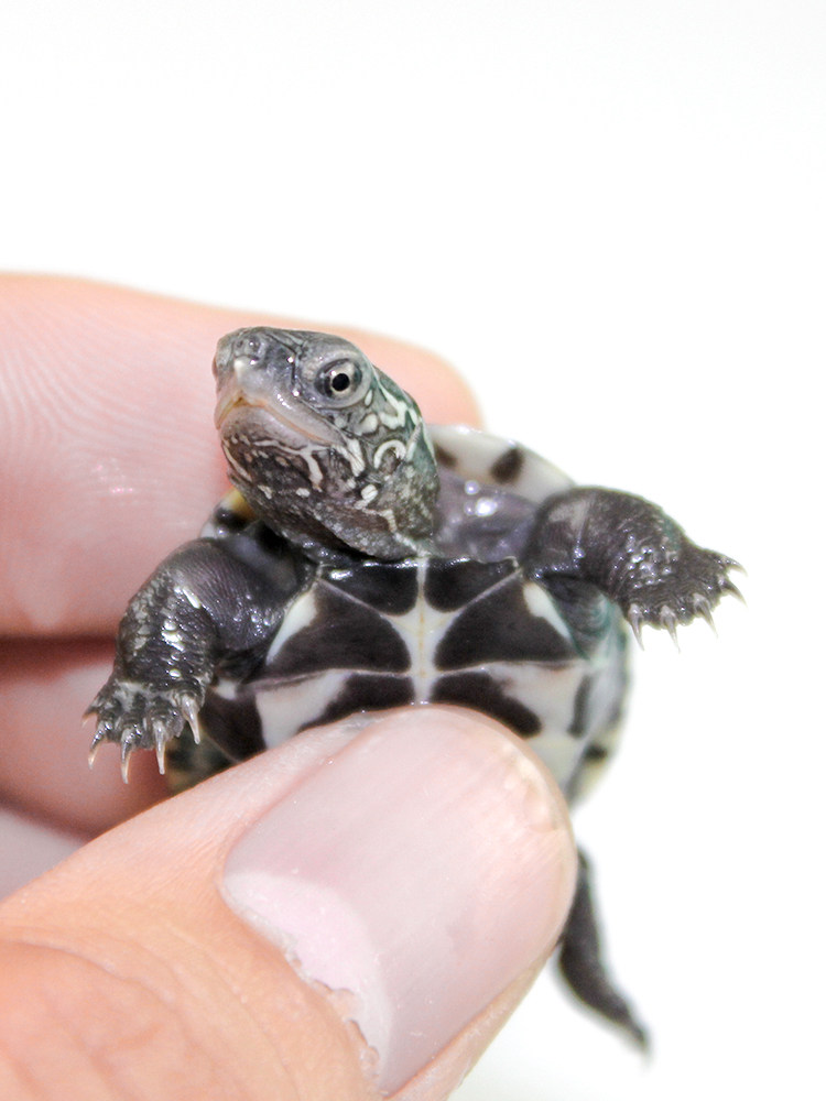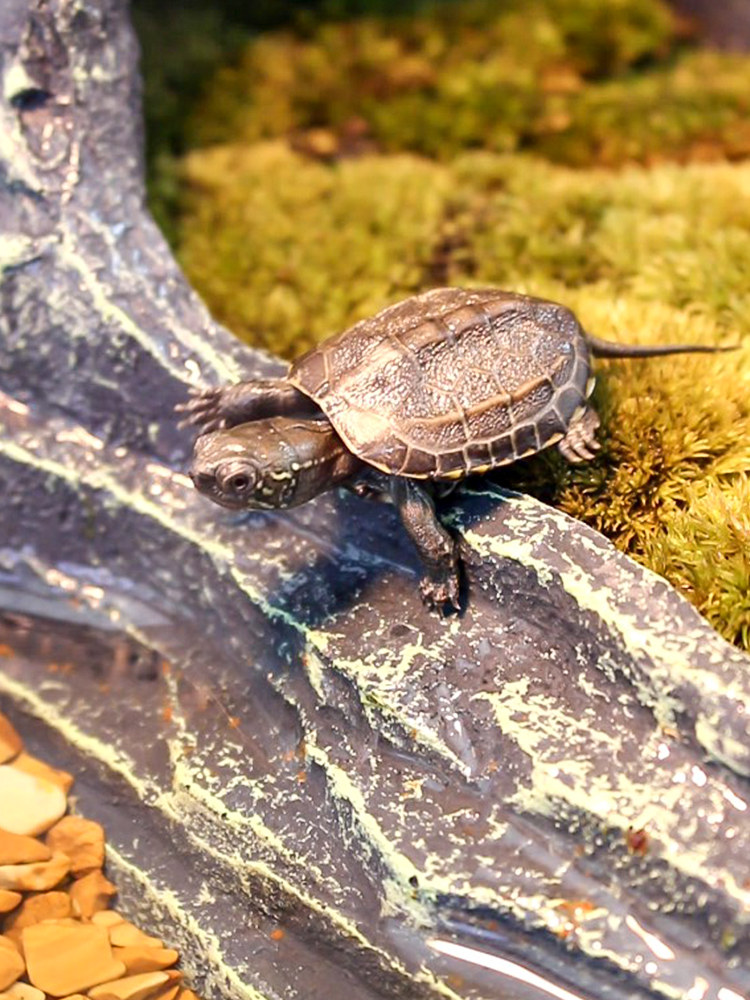 中华草龟,又称金线龟、墨龟,是我国常见的本土水龟品种,性情温顺,适应力强,是理想的入门级宠物龟。其背甲呈棕褐色,腹甲具黑色斑块,雄性成年后体色渐深,可呈墨黑色,故称“墨龟”。幼苗阶段背甲中央有三条明显金线,尤为可爱。中华草龟杂食性,喜食小鱼虾、水生植物及龟粮,适合浅水饲养,需配备晒台供其晒背。相较于巴西龟,草龟更耐寒、少病,且无入侵风险。花龟则花纹艳丽,常与草龟混养。选购时应选择活泼、甲壳完整、眼睛清亮的个体,注意合法合规饲养,避免放生野外,保护生态平衡。
